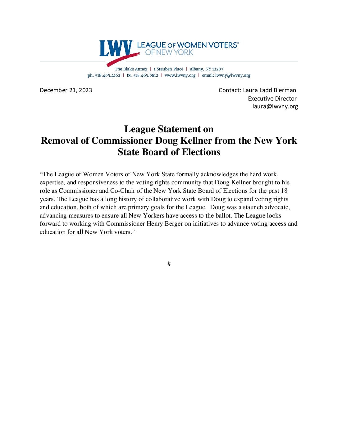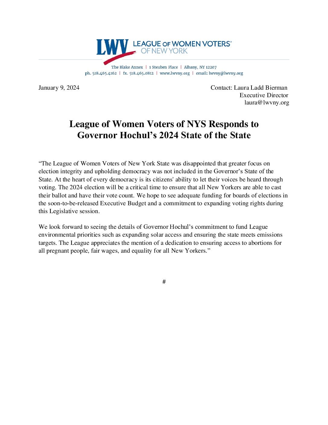 League of Women Voters of NYS Statement on New Congressional Districts Adopted by NYS Legislature
